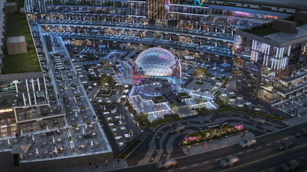 The multi-level structure features a sleek, glass-dominated facade, providing panoramic views and a sense of openness. The project incorporates outdoor terraces on each floor, ideal for dining, lounging, or events. Inside, the building likely gaming zones, restaurants, and event spaces, catering to various entertainment needs. The ground floor includes outdoor cafes and gathering areas, enhancing the project's engagement with the street. Its design promotes a vibrant, interactive atmosphere, blending leisure with modern architectural aesthetics.